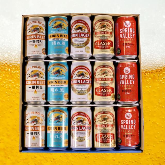 ビールギフト キリンビール 5種 飲み比べ 15本セット 詰め合わせ 一番搾り 晴れ風 キリンラガー クラシックラガー スプリングバレー 缶ビール ギフトセット 内祝い お返し 男性 60代 70代 80代