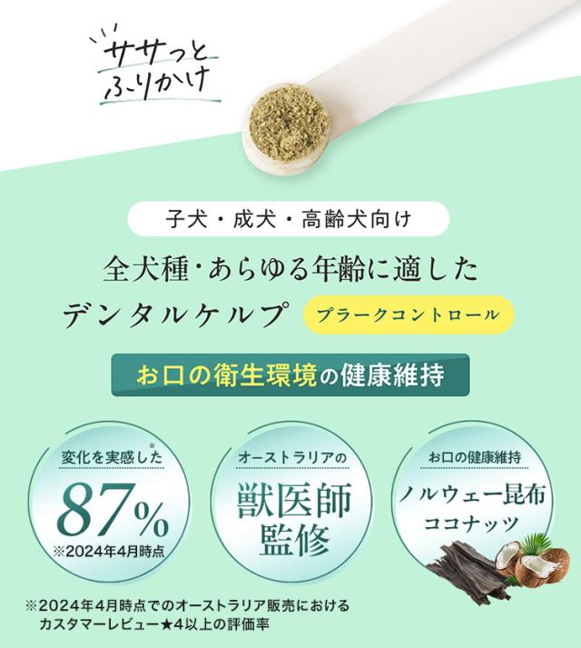 ペット愛護先進国オーストラリアで90%の高評価を取得した、全犬種、子犬〜高齢犬まで使える獣医師監修のサプリメント。ノルウェー昆布とココナッツを配合。ココナッツの風味で、歯磨きが苦手なワンちゃんも手軽にデンタルケアができます。与えやすい粉末タイプで、毎日のごはんにふりかけるだけ。植物油、大豆粉、保存料は含まず、愛犬の健康を維持する主要な成分だけが含まれています。