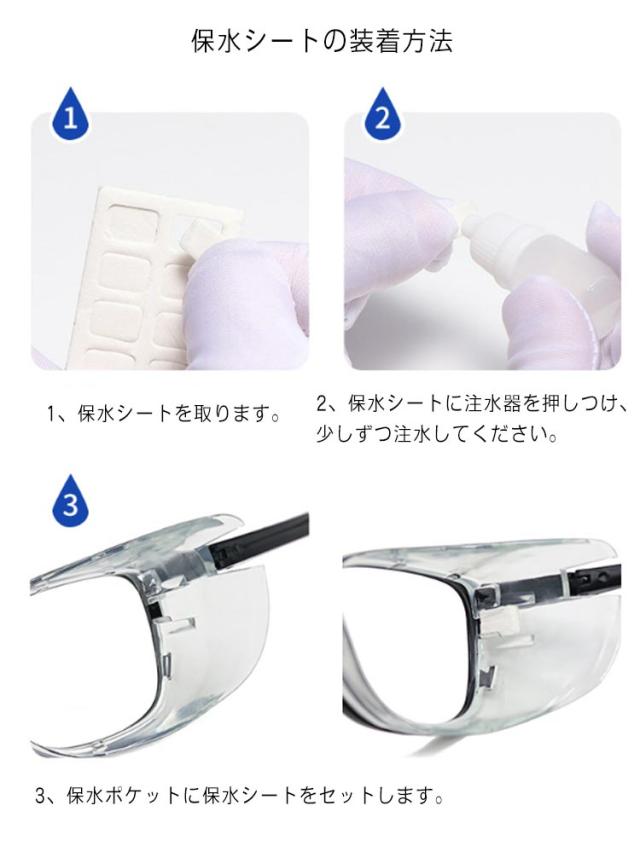 | 花粉対策・目の乾燥対策・ブルーライトカット・紫外線カット・曇り止めの多機能花粉症用メガネ。 ドライアイ対策に、保水シートタイプのメガネ! 全周カバー型で高い花粉カット効果を発揮し、つらい風・ホコリ・花粉などの侵入を防ぎます。 サイドガードにセットする保水シート付き。保水シートに注水してが保湿し、目の乾燥を防ぎます。保水シートの簡単も交換です。 かけるだけでブルーライトカット!スマホやパソコン疲れを軽減! マスクを併用しても曇りにくい防曇レンズを標準搭載。 紫外線99%以上カット。日常のほこりや黄砂、PM2.5対策にも効果があります。 フレームには弾力のあるTR90素材を使用。衝撃に強く柔軟性があり、ソフトにお顔を包み込んで締め付け感がありません。 ドライアイでお悩みの方はもちろん、花粉症の方にもおすすめです。 保水シートの装着方法 1、保水シートを取ります。 2、保水シートに注水器を押しつけ、少しずつ注水してください。 3、保水ポケットに保水シートをセットします。 | |