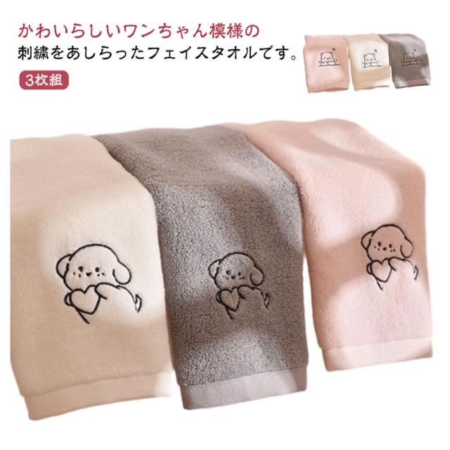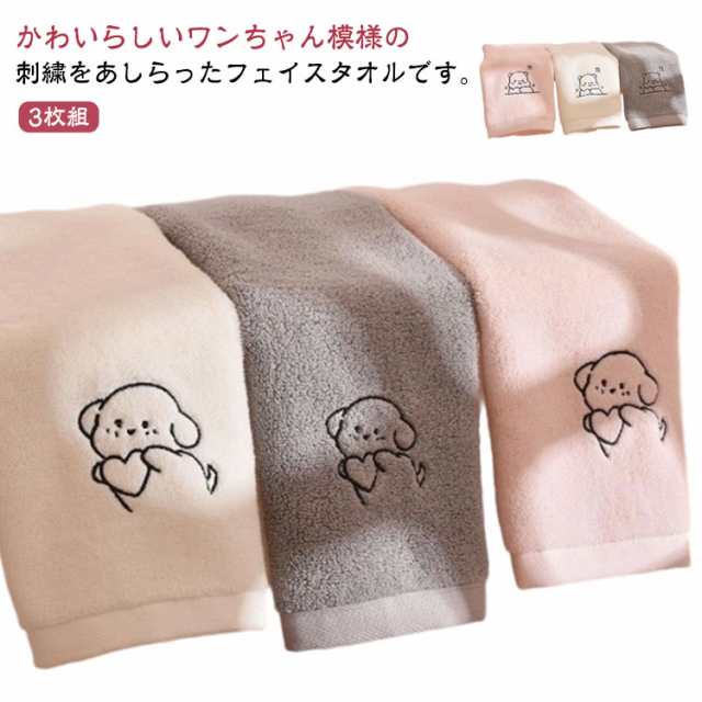 フェイスタオル おしゃれ 3枚セット タオル パイル生地 可愛い ワンちゃん 犬 薄手 デイリータオル 冬 バスタオル 刺?入り 子供用 春 タオル 秋 刺? 大人用 綿100% シンプル 吸水 通気性 ふんわり タオル コットン 家庭用 ギフト ナチュラル 白 ピンク グレー