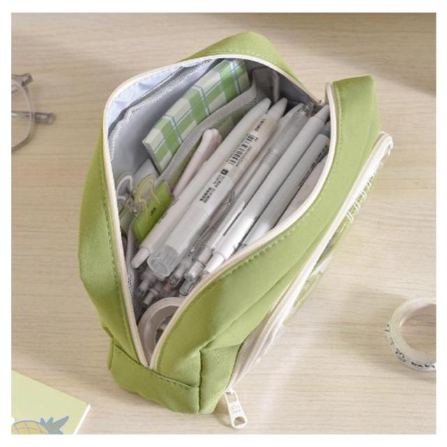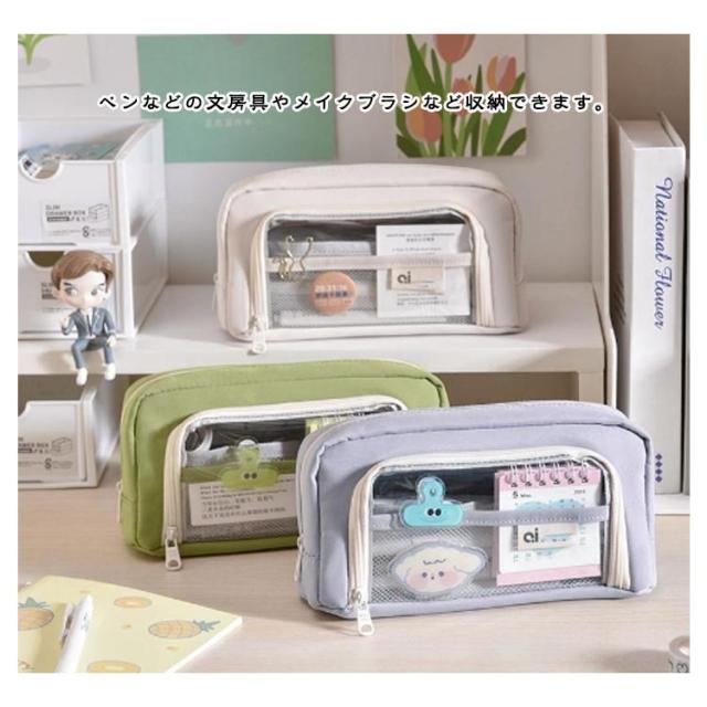 | 外側の透明ポケット部分にまでたっぷり収納できる、大容量ペンケース! トレンドの韓国っぽさたっぷりで可愛いペンケース しっかりとした生地と豊富カラーがおしゃれ! ペンなどの文房具やメイクブラシなど収納できます。 ※クリップなどアクセサリーは付属しません。 | |