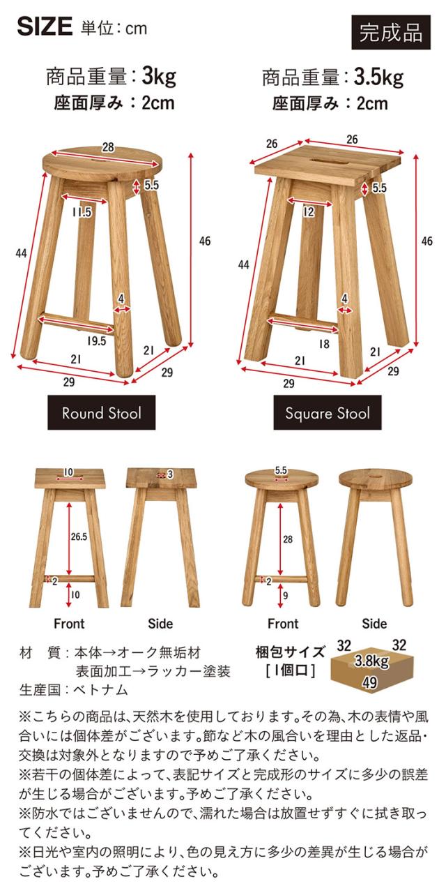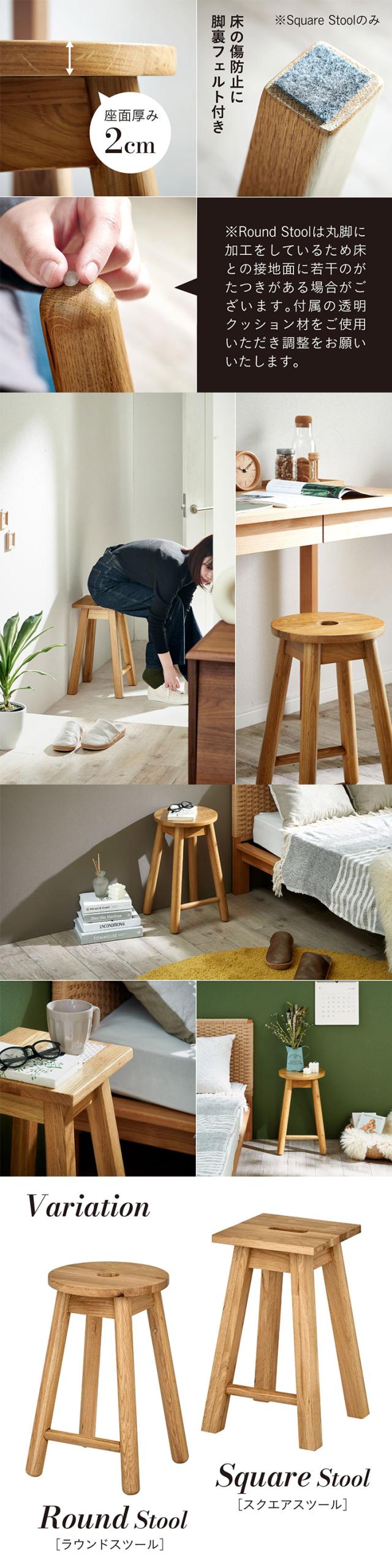 ※脚裏フェルトはSquare Stoolのみとなります。Round Stoolは丸脚に加工しているため床との設置面に若干のガタツキがある場合がございます。付属の透明クッション材をご使用いただきで ※若干の個体差により、表記サイズと完成形のサイズに多少の誤差が生じる場合がございます。