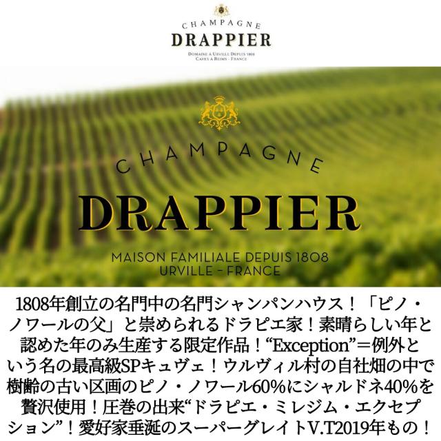 1808年創立の名門中の名門シャンパンハウス! 「ピノ・ノワールの父」と崇められるドラピエ家!素晴らしい年と認めた年のみ生産する限定作品!“Exception”=例外という名の最高級SPキュヴェ!ウルヴィル村の自社畑の中で樹齢の古い区画のピノ・ノワール60%にシャルドネ40%を贅沢使用!圧巻の出来“ドラピエ・ミレジム・エクセプション”! 愛好家垂涎のスーパーグレイトV.T2019年もの!