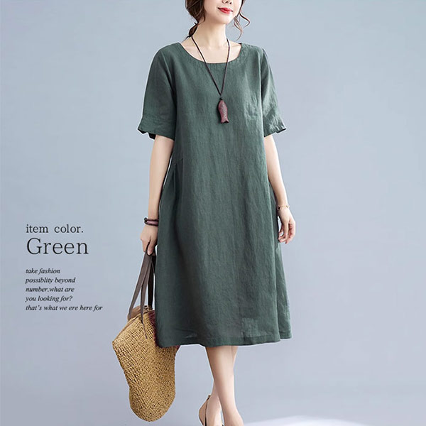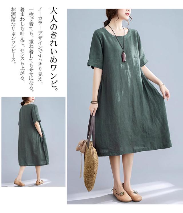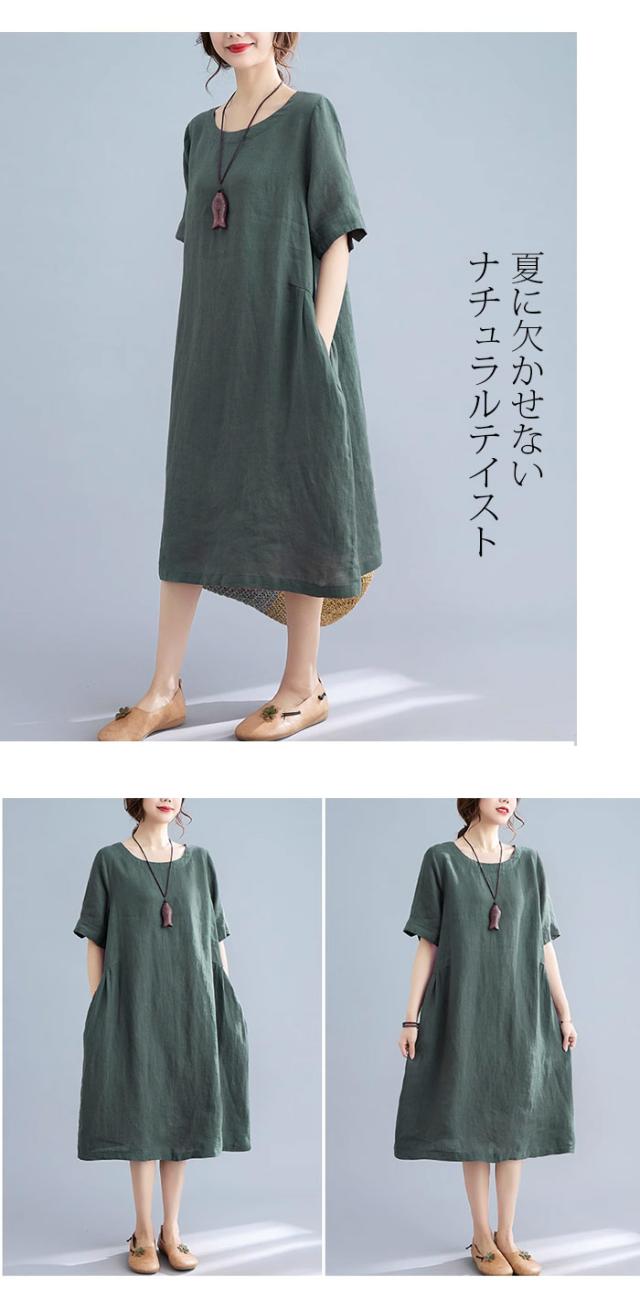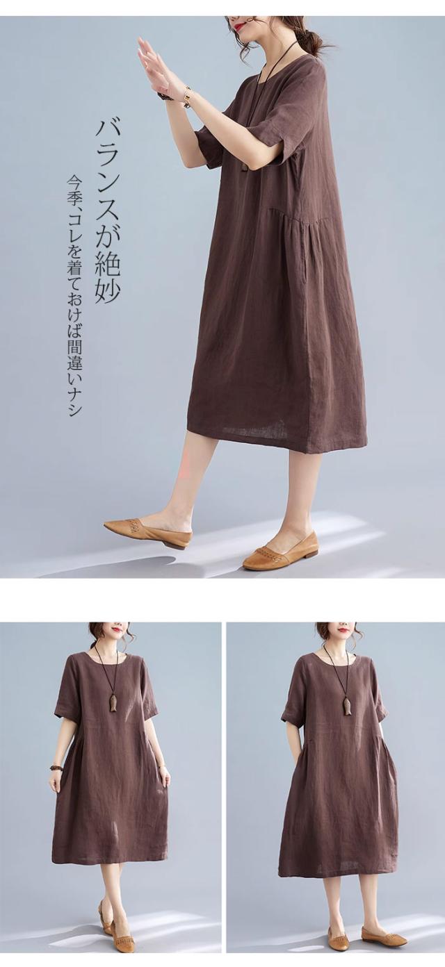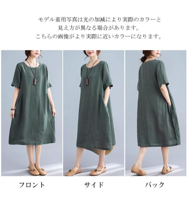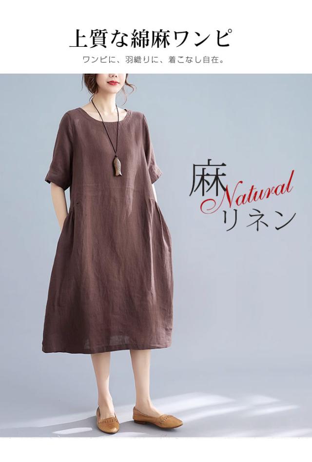 ロング ワンピース 綿麻 レディース リネンワンピース 五分袖 マキシワンピース Uネック フレアワンピース 半袖 ロングワンピ ポケット付き オールインワン 敏感肌 服 ゆったり 大人 体型カバー