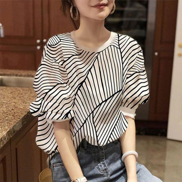 Tシャツ トップス レディース きれいめ 40代 幾何柄 半袖トップス 白インナー オシャレ ブラウス tシャツ 綿 大きいサイズ 着痩せ 韓国風