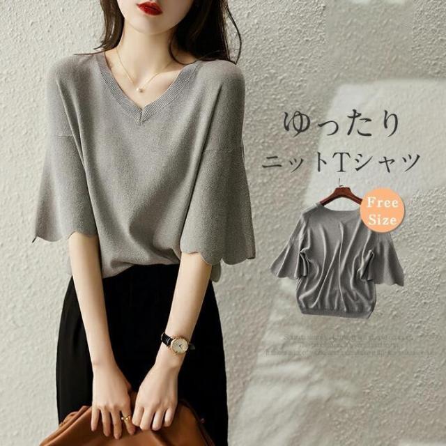 シャツ Tシャツ ブラウス レディース 夏 サマーニット ニットソー 半袖 五分袖 フレア袖 ニット 薄手 伸縮性 フォーマル オフィス ゆったり きれいめ