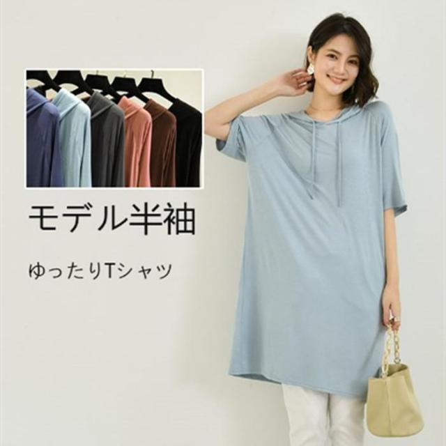 チュニックTシャツ レディース フード付き 半袖 カットソー 大きいサイズ ロングTシャツ チュニック Tシャツ トップス 半袖 着心地 綿 プルオーバー パーカー