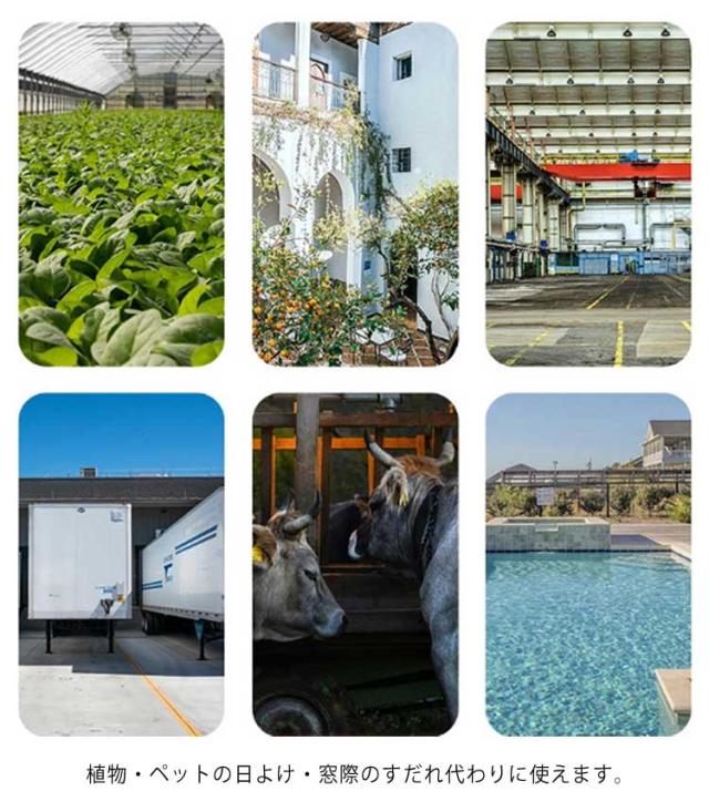 | 遮光率95%!紫外線対策、暑さ対策グッズ遮光ネット。【4mx5m】【遮光率90%/95%/98%!3タイプ選べる】 植物・ペットの日よけ・窓際のすだれ代わりに使えます。 1M(100cm)間隔ででハトメがついていますので、ひも等で固定しやすく、設置もらくらくできます。 縁はテープで補強し、ハトメを付ける事で生地を強化しほつれにくく、目ずれしません。 酸やアルカリなどの製品にも強く、耐久性があり腐食や伸縮が起こりません。 日差しが特に強い場所や日中常に日の当たる場所、非常に強い西日の当たる場所におすすめします! | |