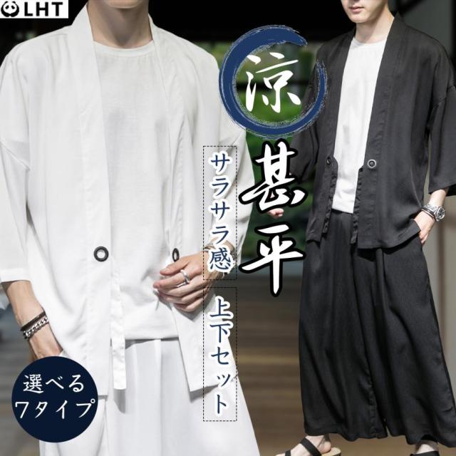 甚平 メンズ 七分丈 夏用 セットアップ ルームウェア 父の日 上下セット 和式 羽織り 袴風ズボン 花火大会 祭り 大きいサイズ おしゃれ 部屋着 贈り物 LHT