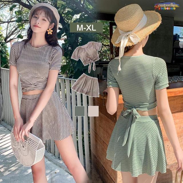 水着 レディース スカート水着 2点セット 体型カバー 水着 ボーダー柄水着 ハイネック ハイウエスト スイムウエア ビーチウェア 水泳 小胸 水着 可愛い