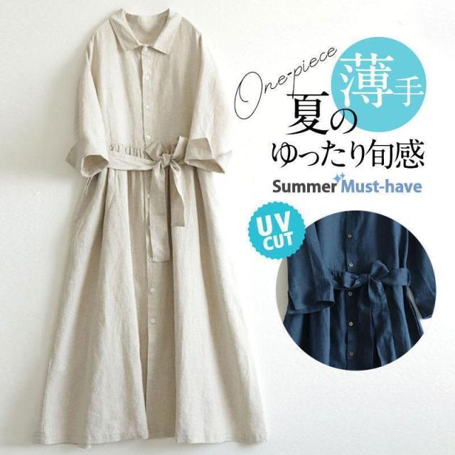 ワンピース レディース ロング丈 マキシ丈 七分袖 リネン 半袖 シャツ ワンピース 春 夏 春服 夏服 きれいめ ゆったり チュニック