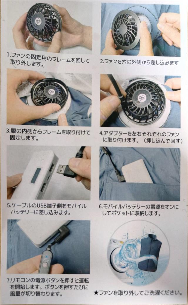 服は洗濯機でお洗濯が可能です。洗濯前に、電池、扇風機、電源ケーブルを取り外してください。