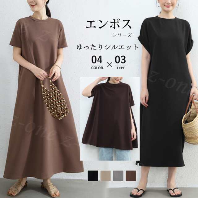 ワンピース プルオーバー エンボス加工 3type 夏新作 送料無料 ストレッチ 伸縮性 無地 体型カバー シンプル 丸首 ラウンドネック ロングワンピース レディース マキシ丈 フレア イージーケア 速乾 クルーネック 半袖 ゆったり 薄手 父の日