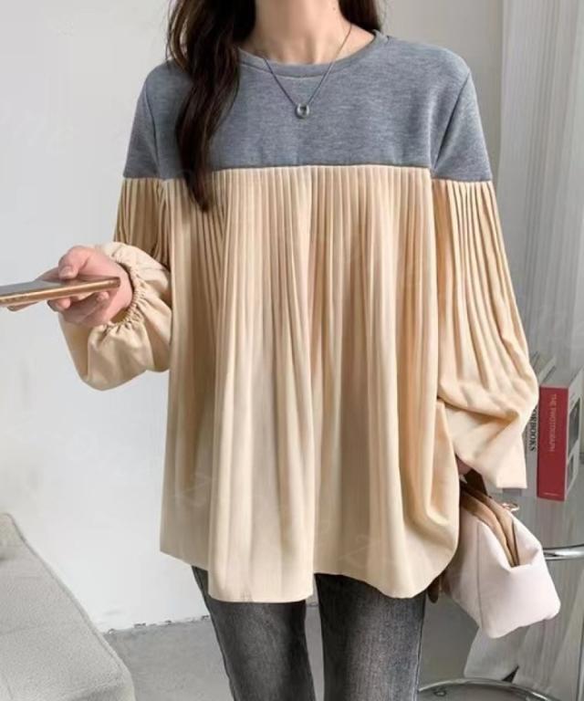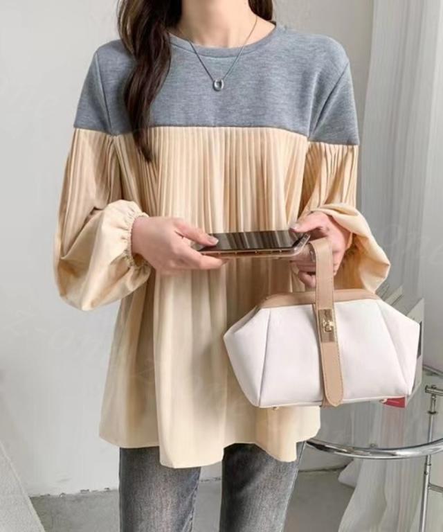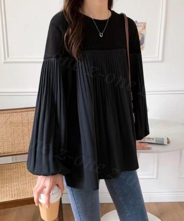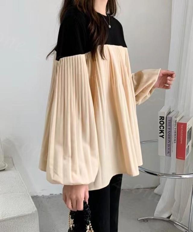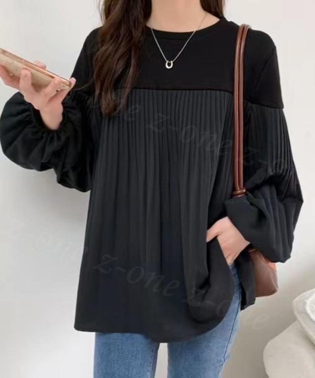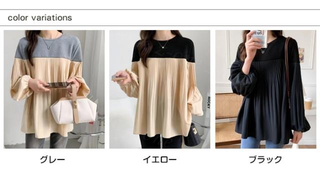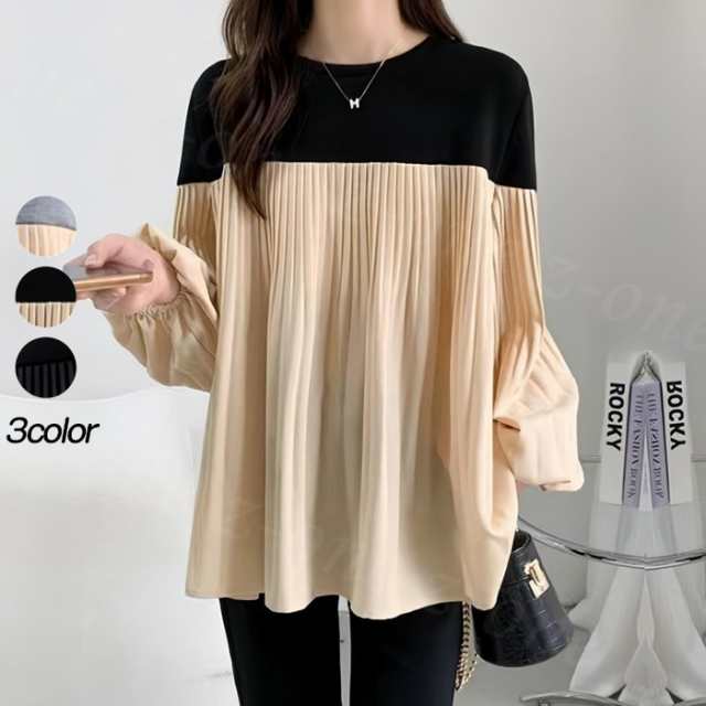 トップス 長袖 Tシャツ バルーンスリーブ レディース 春 夏新作 送料無料 バイカラー プリーツ 着やせ カジュアル ゆったり 体型カバー 女性 上品 ファッション 韓国 父の日