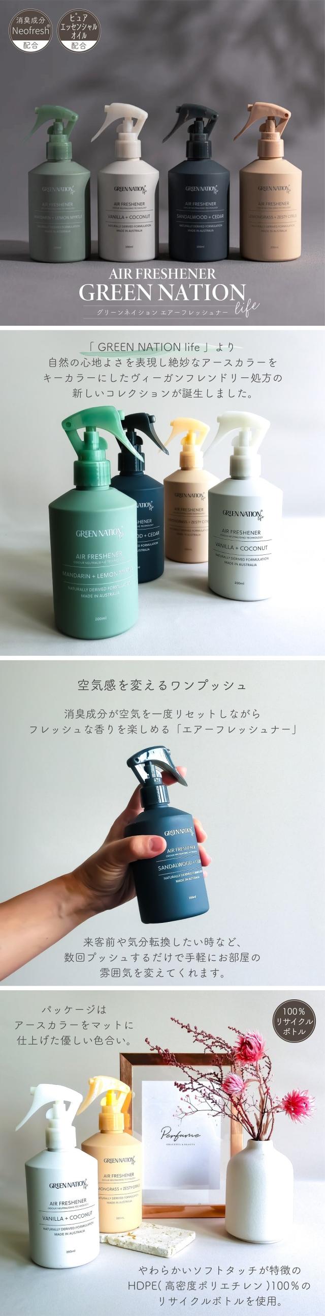 アロマ GREEN NATION life グリーンネイションライフ エアーフレッシュナー 200ml 消臭成分配合 ピュアエッセンシャルオイル配合 最上級フレグランスオイル配合 アースカラー リサイクルボトル ヴィーガンフレンドリー 消臭スプレー ルームミスト フレグランス インテリア
