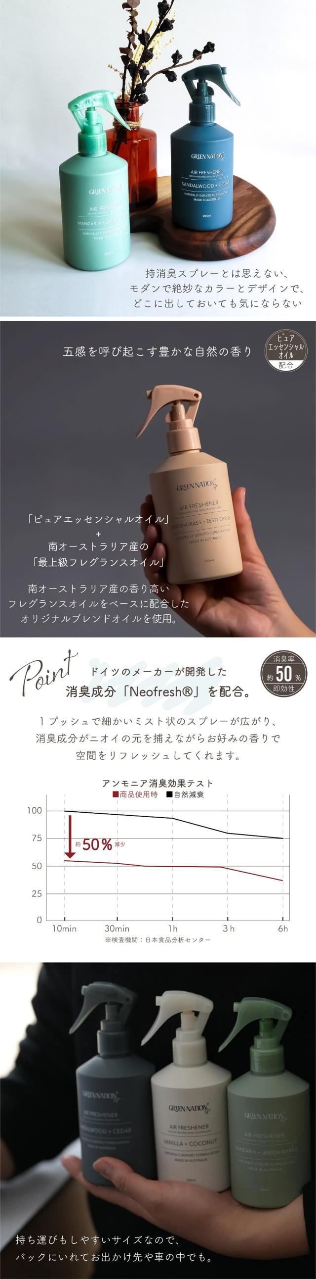 ドイツのメーカーが開発した消臭成分 Neofreshを配合。1プッシュで細かいミスト状のスプレーが広がり、消臭成分がニオイの元を捕えながらお好みの香りで空間をリフレッシュ