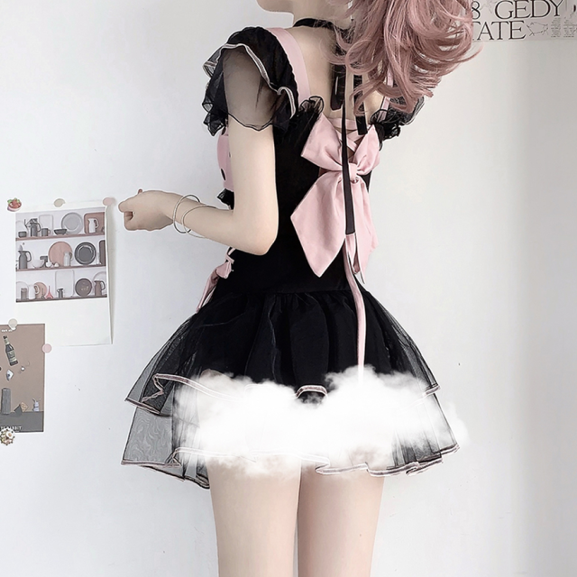 ショルダー部分とスカートの裾にはブラックのチュールフリルが重ねられ、ふんわりとしたボリューム感がドーリーな可愛さを引き立てます。