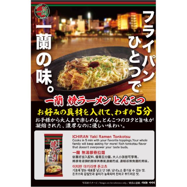 一蘭の味をご家庭で簡単にフライパン1つで調理できる焼ラーメンが完成いたしました。お好みの具材を入れることでアレンジの幅が広がりお子様から大人までご満足いただける濃厚かつやさしい味わいに仕上げました。