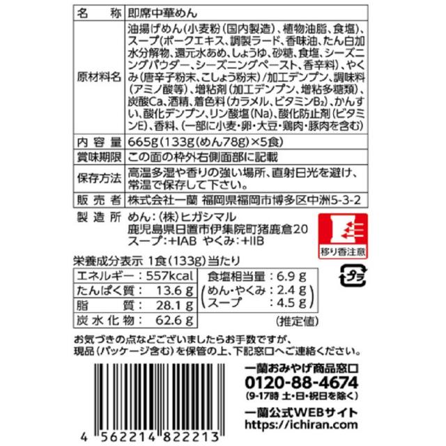 商品名 一蘭ラーメン ちぢれ麺 一蘭特製 赤い秘伝の粉付 5食入 容量 665g 原材料名 油揚げめん(小麦粉(国内製造)、植物油脂、食塩)、スープ(ポークエキス、調製ラード、香味油、たん白加水分解物、還元水あめ、しょうゆ、砂糖、食塩、シーズニングパウダー、シーズニングペースト、香辛料)、やくみ(唐辛子粉末、こしょう粉末)/加工デンプン、調味料(アミノ酸等)、増粘剤(加工デンプン、増粘多糖類)、炭酸Ca、酒精、着色料(カラメル、ビタミンB2)、かんすい、酸化デンプン、リン酸塩(Na)、酸化防止剤(ビタミンE)、香料、(一部に小麦・卵・大豆・鶏肉・豚肉を含む) アレルギー特定原材料 小麦、卵 賞味期限 商品の発送時点で、30日以上あるものをお届けいたします 保存方法 高温多湿や香りの強い場所、直射日光を避け、常温で保存して下さい。