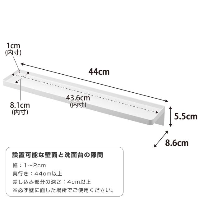 | 備考 | 【設置可能な壁面と洗面台の隙間】 幅:1〜2cm、奥行き:44cm以上、差し込み部分の深さ:4cm以上 ※必ず壁に面した場所でご使用ください。 |