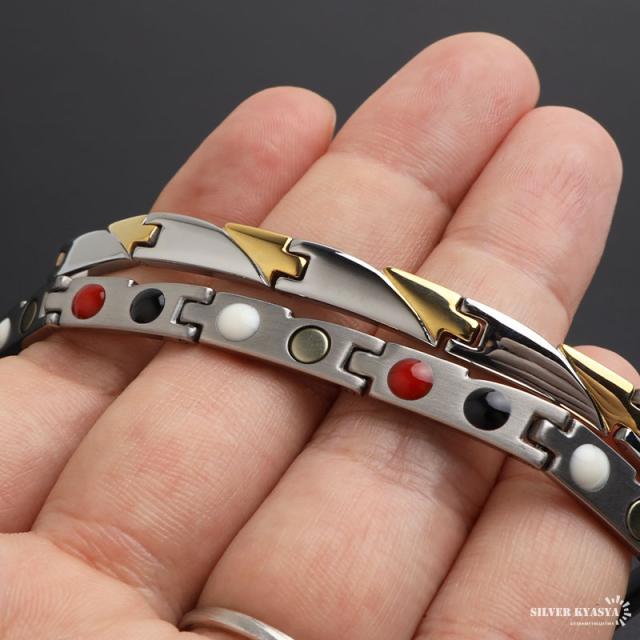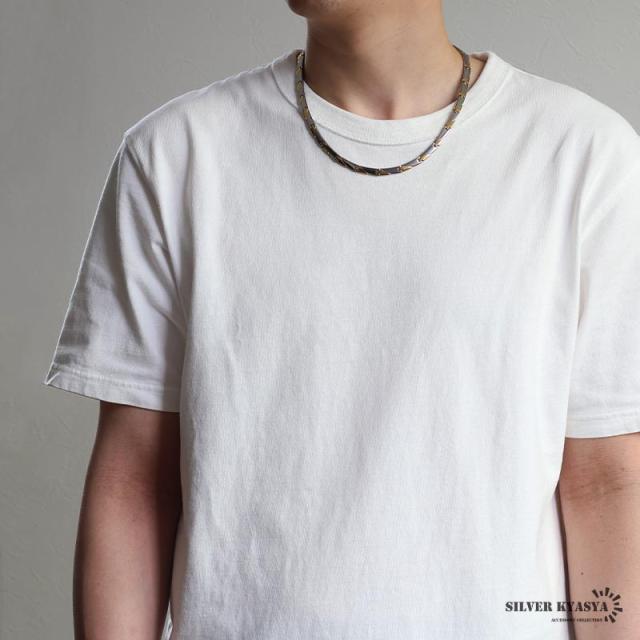 チタニウム素材を使用した、磁気ネックレス。シャープなフォルムにバイカラーがマッチした逸品。内側に並ぶ、4種類のビーズがさりげないお洒落を演出。