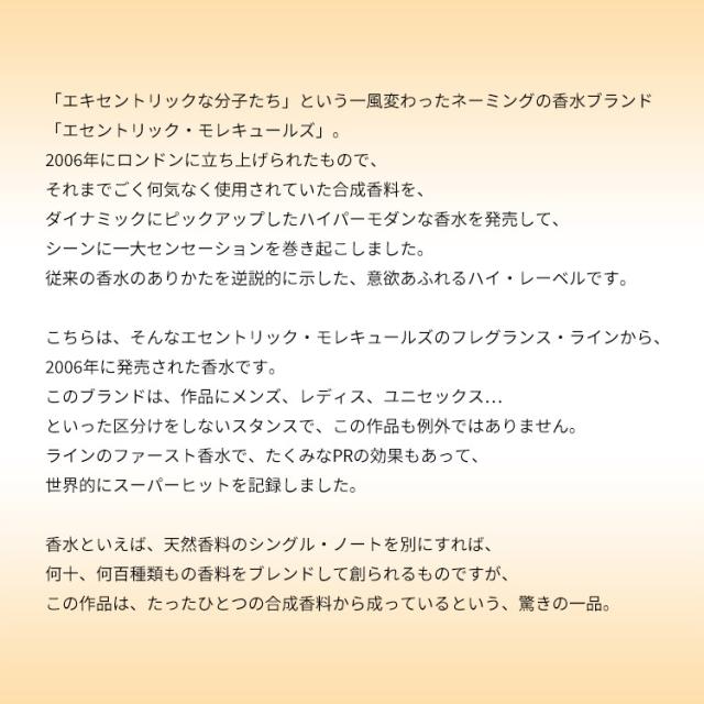こちらは、そんなエセントリック・モレキュールズのフレグランス・ラインから、2006年に発売された香水です。