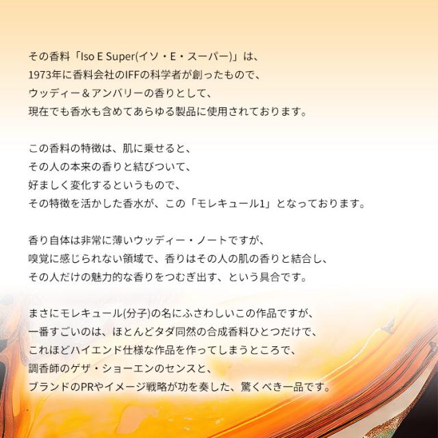 この香料の特徴は、肌に乗せると、その人の本来の香りと結びついて、好ましく変化するというもので、その特徴を活かした香水が、この「モレキュール1」となっております。