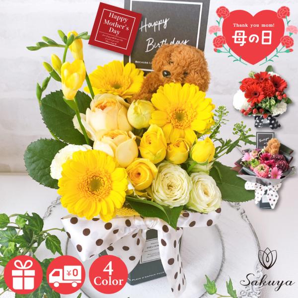 母の日 花 2025 フラワーアレンジメント ギフト 発表会 生花 プレゼント 記念日 犬 ボックス 送料無料 黄色 赤 ピンク 白 メッセージカード