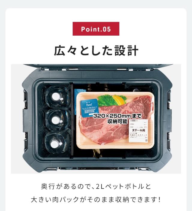 | 座れるクーラーボックス。 断熱材の厚みが従来品の約2倍で保冷力大幅アップ。 フラットなフタはイスやテーブルとして使用できる強度。 市販の南京錠が取り付けられる鍵穴付き。 ・断熱材厚み約2倍(従来品比較)で保冷力大幅アップ。 ・フタ耐荷重100kgでイスとしても使用可能な強度。 ・フラットなフタ形状でサイドテーブルとしても使用可能。 ・移動が楽な大型キャスター(φ120mm)。 ・積み重ね可能。 ・奥行があるので、大きい肉パック(320×250mmまで)がそのまま収納できます。 ・南京錠がかけられる鍵穴付き。 ・前面幅広1、左右各1の3点バックル仕様で密閉度が向上。 ・左右ハンドル(片側ロングハンドル)。 ・トレーと仕切板が付属。 ・水抜栓付き。 ・用途と収納するものを想定したサイズ展開。 |