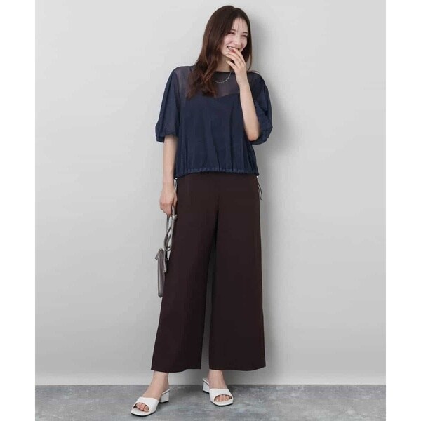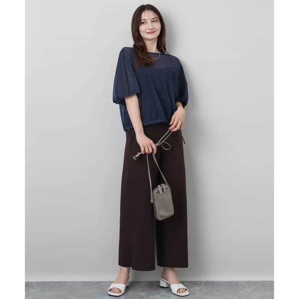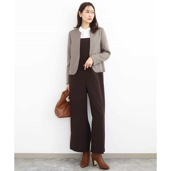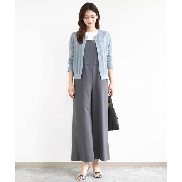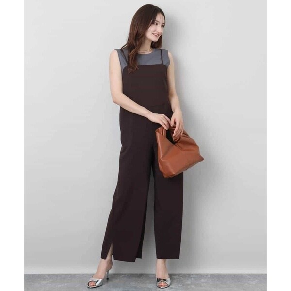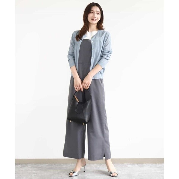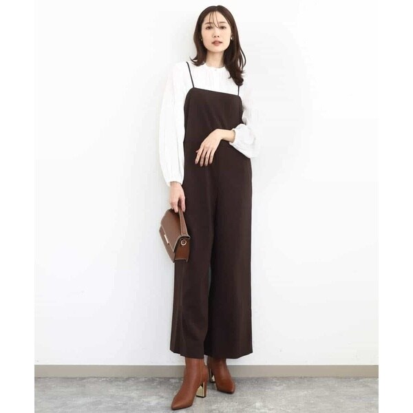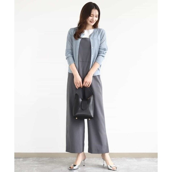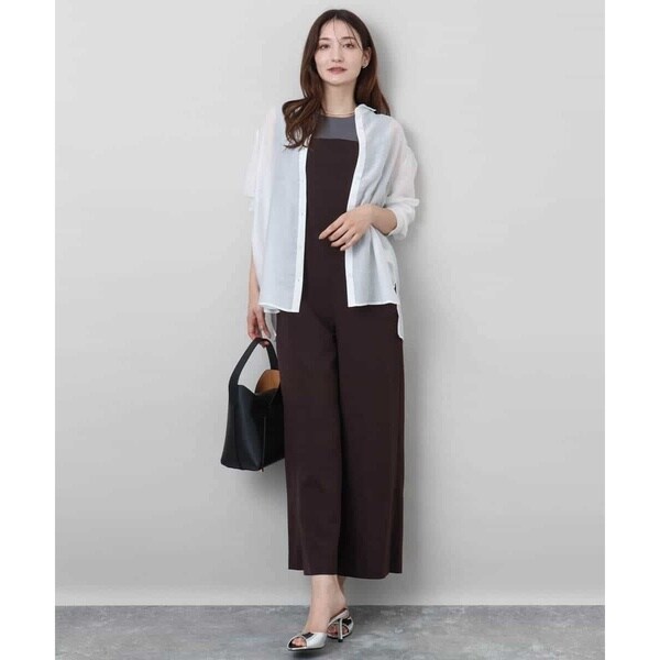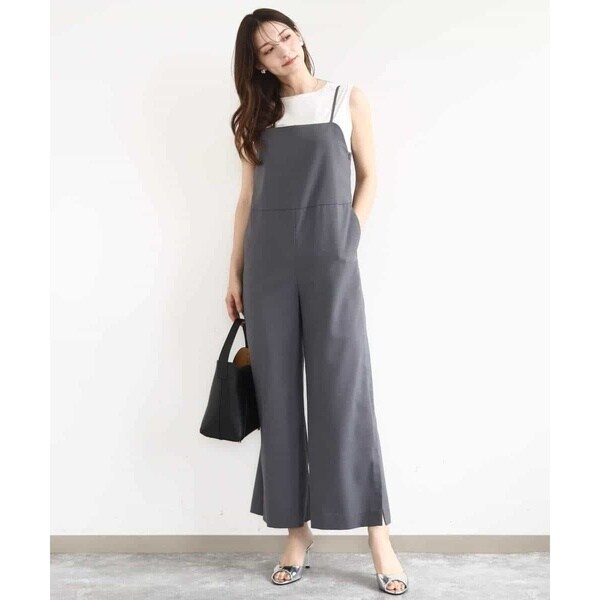 すっきりシルエットがカジュアルすぎない、大人の方におすすめのきれいめコンビネゾンです。素材感はさらりとした手触りのポリエステル素材で、重たさのない軽い着心地。表面感はテカテカしないマットな質感で、ナチュラルときれいめの中間くらいの印象でした。サイズ感は細身すぎず、身体に沿うくらいのほどよいゆとりあり。ウエストの切り替えデザインで腰位置も高く見えるので、長め丈の羽織ものとも相性よく合わせられるのがうれしいポイントです。