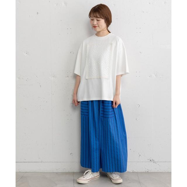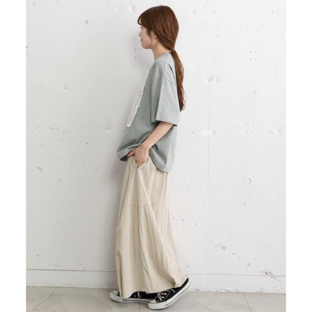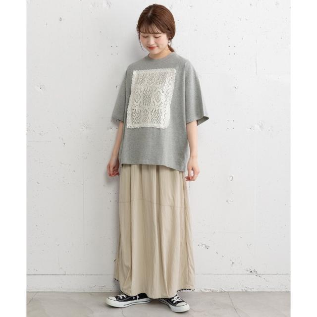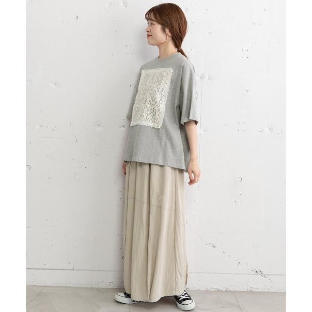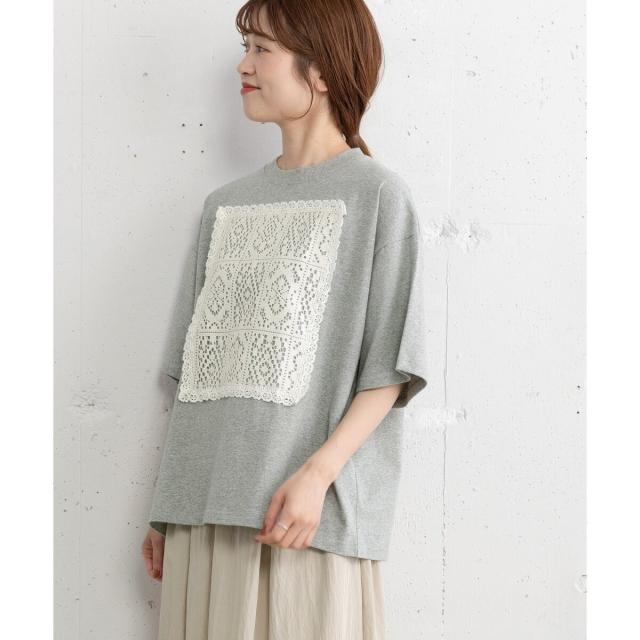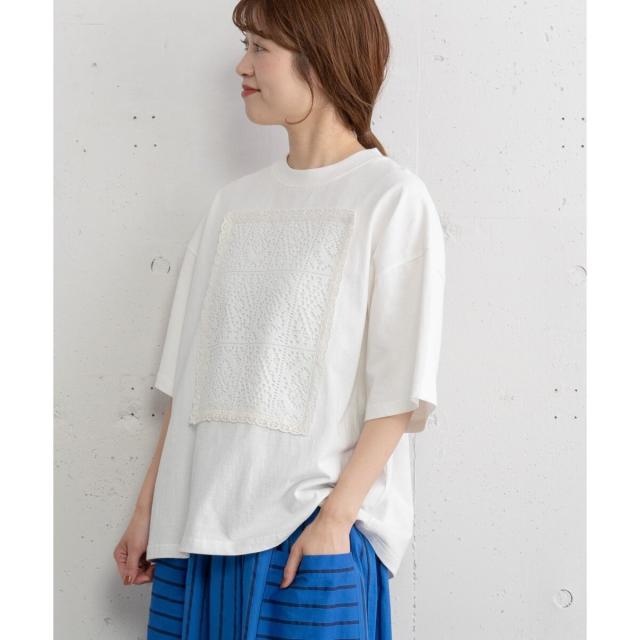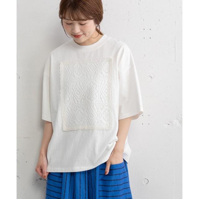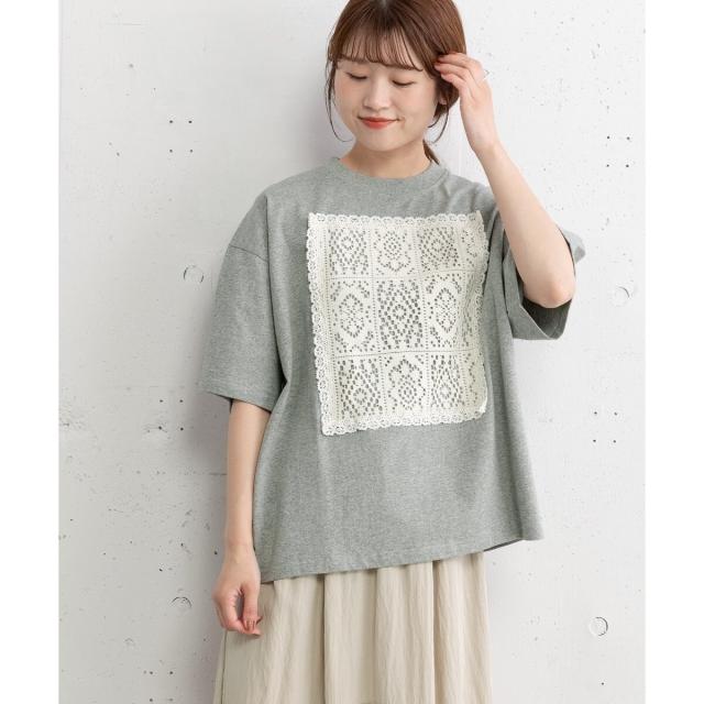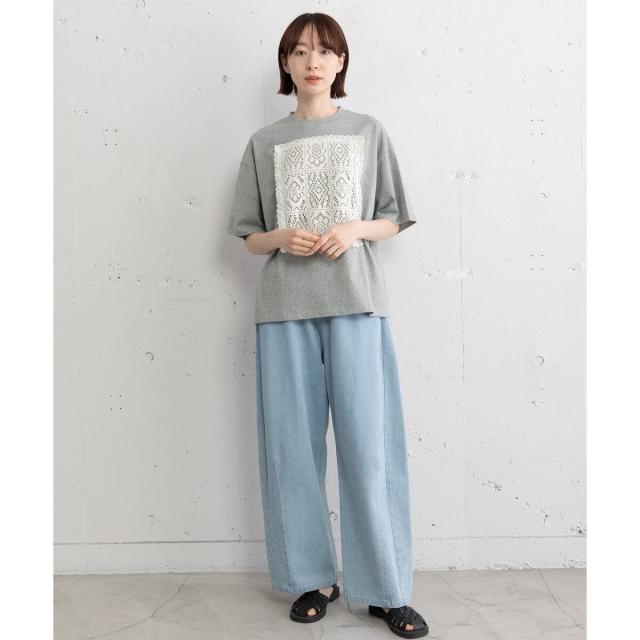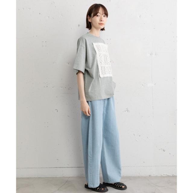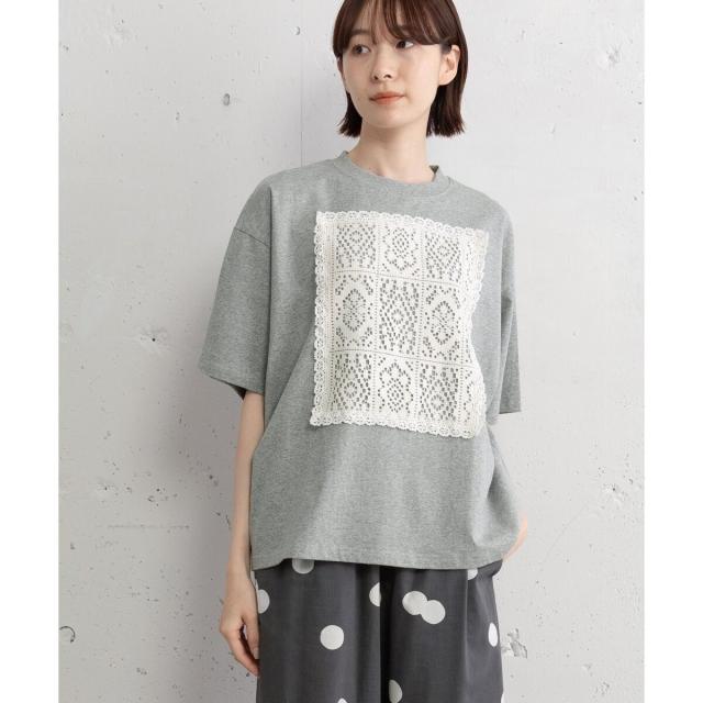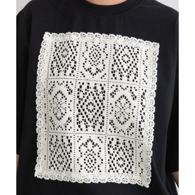 メンズライクなボックスTシャツにレースをたたきつけた、リメイク風のデザインTシャツ。オフホワイトはボディ同色、ブラックとグレーはキナリのレースを使用しています。程よい着丈でイン・アウトスタイルが気分に合わせてお楽しみいただけます。