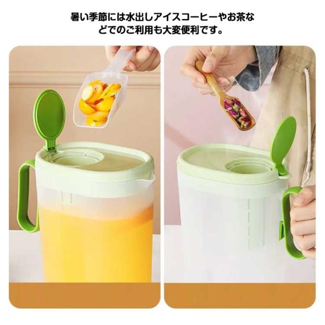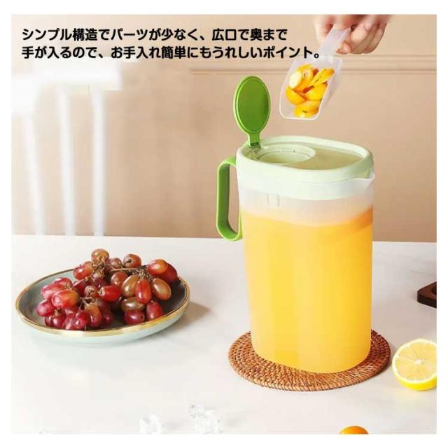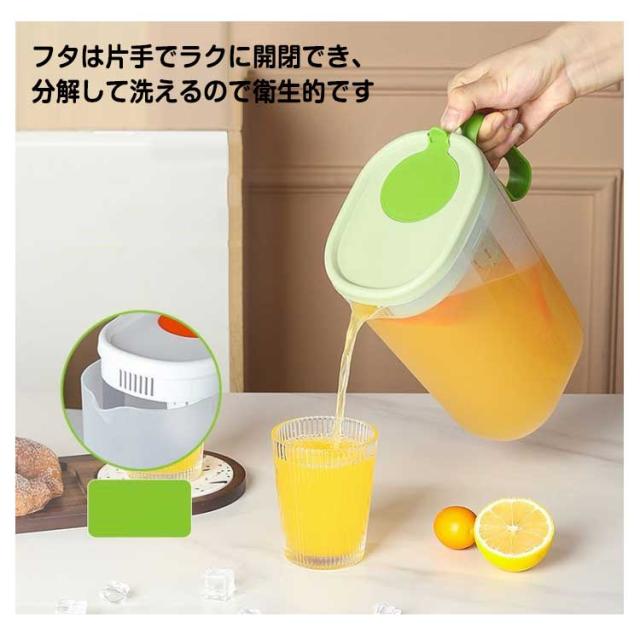 | 冷蔵庫の棚に置きできる冷水ポット 良い品質のPPを採用して作られたこの冷水筒は丈夫で地面に落ちても割れない、そして長く使えて耐久性も優れています フタは片手でラクに開閉でき、分解して洗えるので衛生的です シンプル構造でパーツが少なく、広口で奥まで手が入るので、お手入れ簡単にもうれしいポイント。 暑い季節には水出しアイスコーヒーやお茶などでのご利用も大変便利です。 大容量なのにスリム設計。 | |