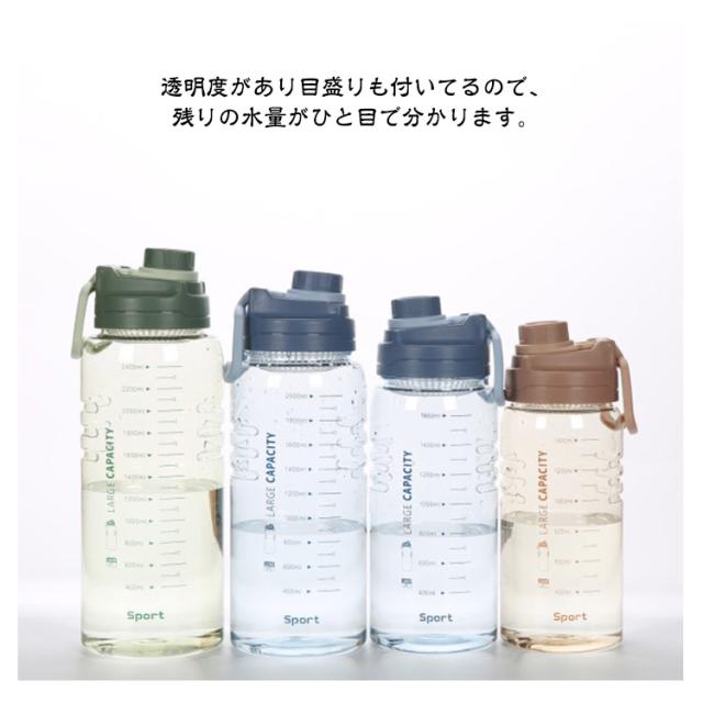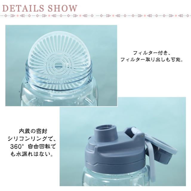 | スポーツや外出時に便利なドリンクボトル! 透明度があり目盛りも付いてるので、残りの水量がひと目で分かります。 このスポーツボトルはマラソンやジムなどに最適です。 水分補給と一日中十分な水を飲むことを思い出させます。 このウォーターボトルは人体に悪影響のないPP素材を採用し、無臭で健康的な水飲みに。 大型のウォーターボトルは、1日を通して毎日の水とフィットネスのニーズを満たすことができます。 フィルター付き、 フィルター取り出しも可能。内蔵の密封シリコンリングで、360°自由回転でも水漏れはない。 ウォーターボトル ジム、旅行、自動車、ジョギング、ヨガ、砂浜、登山、キャンプ、遠足、学校、家庭などに使用できます。 | |