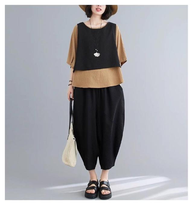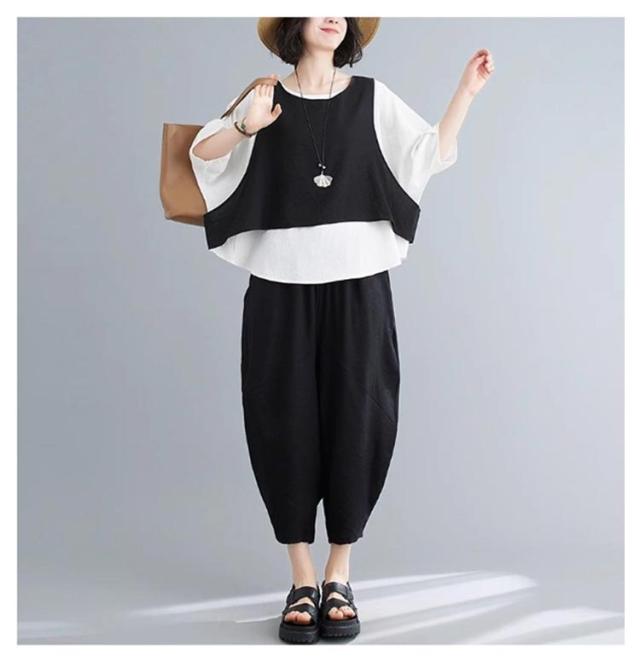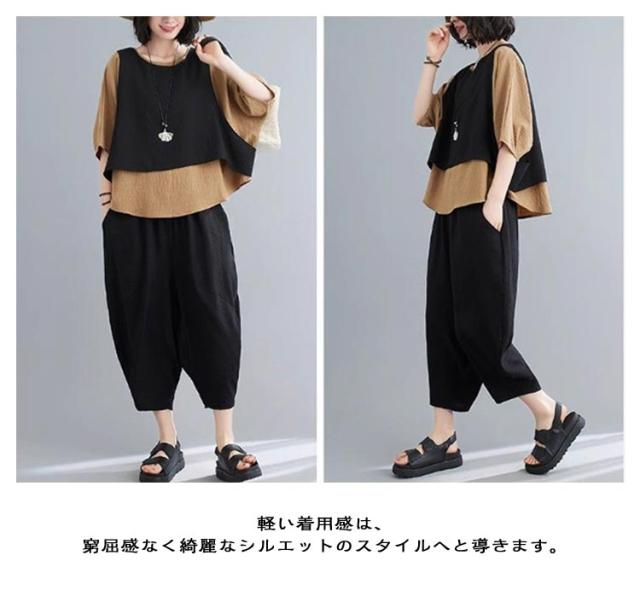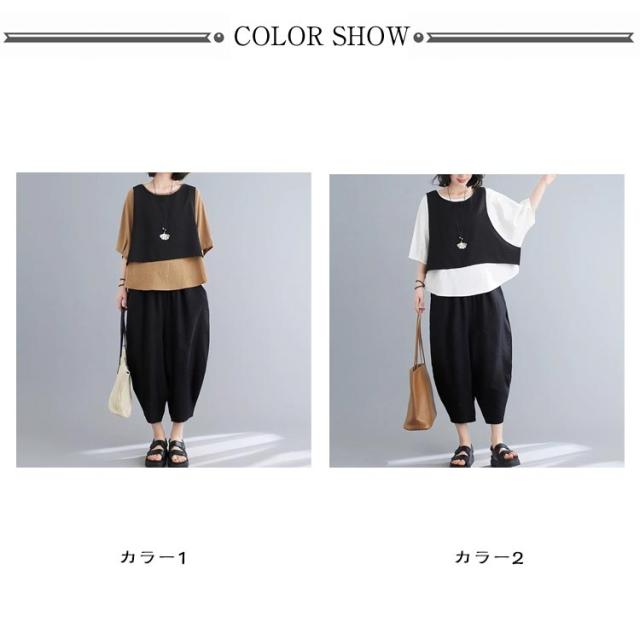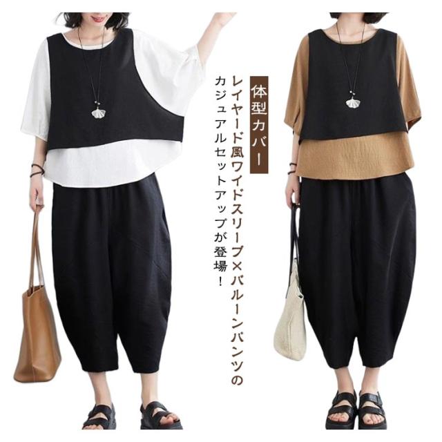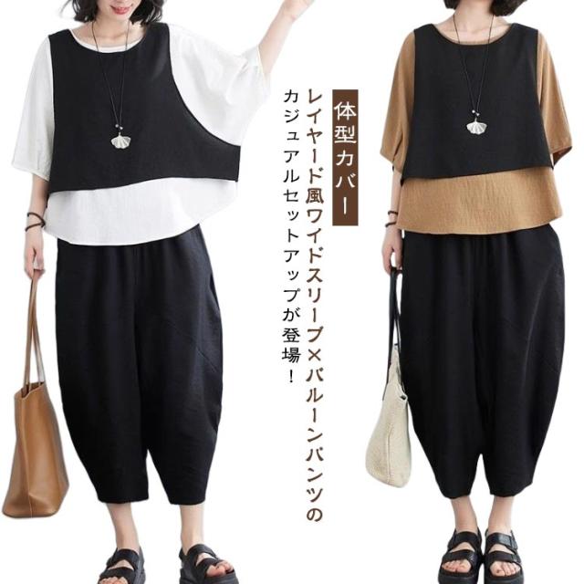 おしゃれ L レディース カジュアルセット 上下セット 体型カバー フェイクレイヤード バルーンパンツ セットアップ ゆったり 着痩せ 春夏 レトロ 大きいサイズ 半袖 XL 2XL 3XL 4XL 5XL