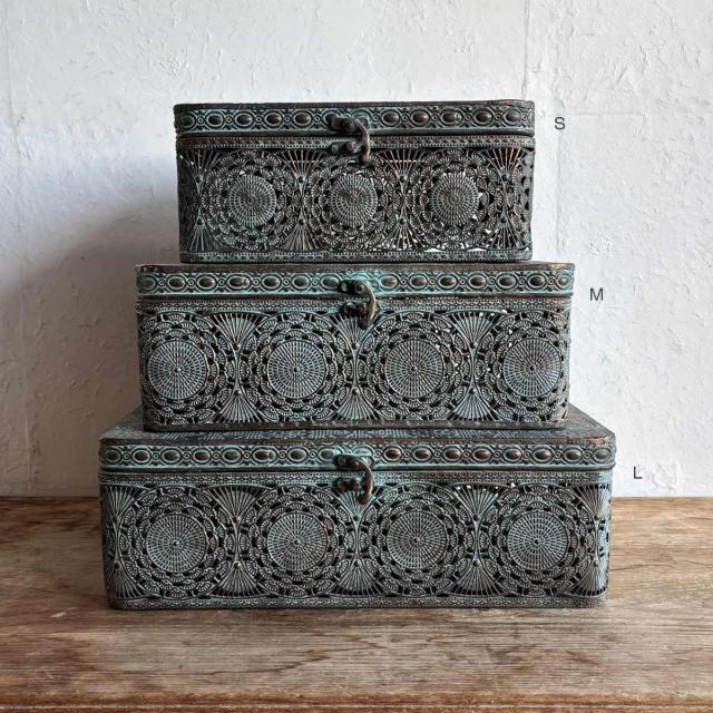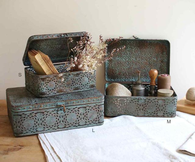 《 LH18999 アンティーク調 オブジェ オーナメント お道具入れ バスケット 収納かご 見せる収納 魅せる収納 リビング 玄関 装飾 カフェ 飾り おしゃれ オシャレ お洒落 ブリキ製 デザイン 透かし アンティーク雑貨 宝箱 店舗 什器 青銅 色 アイテム サイズ 積み重ね かわいい カワイイ 》