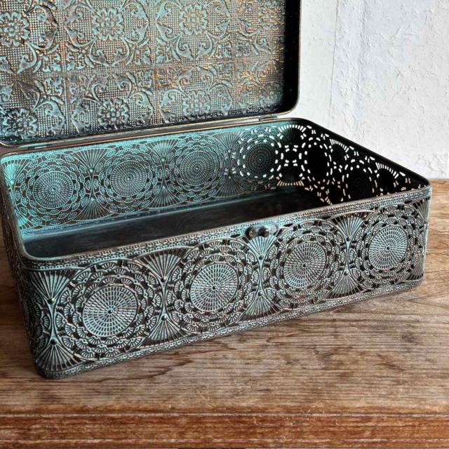 繊細なレース模様が施されたブリキ製の収納ボックス