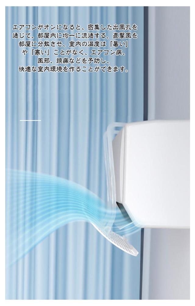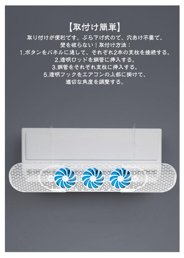 | エアコンの直撃風を防ぐ!3つの風車付きでエアコンの風を循環! エアコンがオンになると、密集した出風孔を通じて、部屋内に均一に流通する,直撃風を部屋に分散させ、室内の温度は「暑い」や「寒い」ことがなく、エアコン病、風邪、頭痛などを予防し、快適な室内環境を作ることができます。 【取付け簡単】取り付けが便利です。ぶら下げ式ので、穴あけ不要で、壁を破らない!取付け方法:1.ボタンをパネルに通して、それぞれ2本の支柱を接続する。2.透明ロッドを鋼管に挿入する。3.鋼管をそれぞれ支柱に挿入する。5.透明フックをエアコンの上部に掛けて、適切な角度を調整する。 【多機種対応&夏も冬も快適に過ごせる】さまざまなニーズに対応でき、調節しやすく、使いやすい。冷暖房兼用で、ほとんどの家庭用・共用エアコン機種に対応。エアコンの風が直接当たることによる冷えや乾燥を防ぐ役割を担っています。風除けで分散された風が部屋全体に広がり、室温が均一に整いやすいのが特徴です。「ここは寒い」「ここは暑い」等の温度ムラを軽減します。 【角度調節対応】エアコンの直撃風を解消する!健康な生活を与えて、風邪を引く可能性がおおきく低くなる!ルーバーだけでなく、アームによる上下移動と合わせて細かく調整可能です。家のどこにいても冬も夏も快適! 健康に過ごせて省エネ効果も期待できるエアコン風よけカバです。 | |