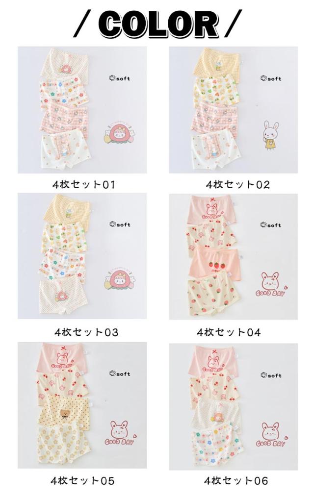 | 女の子用下着4枚組 かわいいカトゥーン柄 安全なコットン素材、肌に優しい 通気性、吸汗性にス優れている 柔らかくて動きやすく、肌触りがとてもよい ストレッチ性良いウエストゴム着脱便利 | |