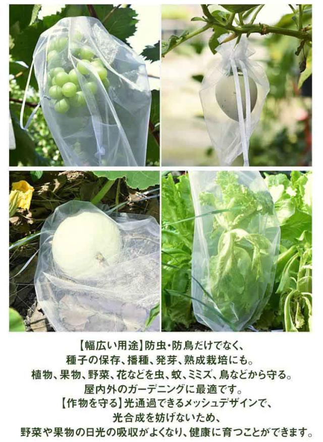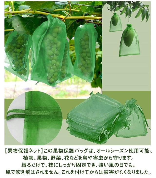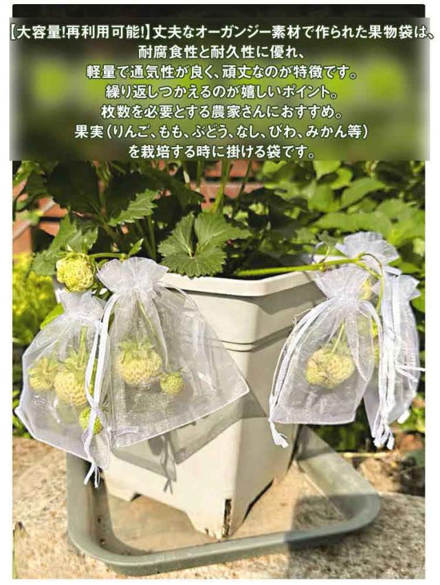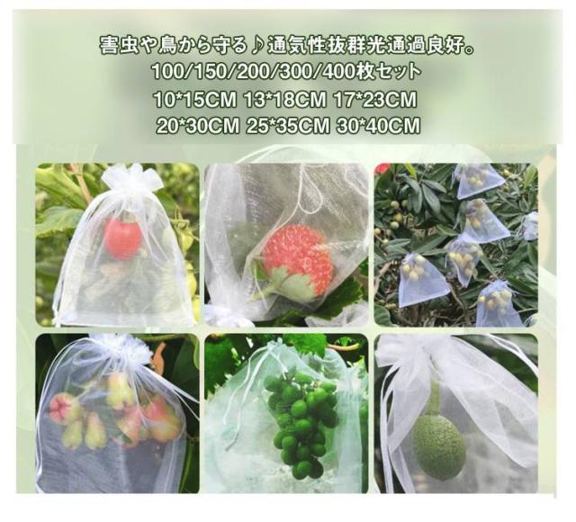 | 害虫や鳥から守る♪通気性抜群光通過良好。 100/150/200/300/400枚セット 10*15cm 13*18cm 17*23cm 20*30cm 25*35cm 30*40cm 【幅広い用途】防虫・防鳥だけでなく、種子の保存、播種、発芽、熟成栽培にも。 植物、果物、野菜、花などを虫、蚊、ミミズ、鳥などから守る。 屋内外のガーデニングに最適です。 【作物を守る】光通過できるメッシュデザインで、光合成を妨げないため、野菜や果物の日光の吸収がよくなり、健康に育つことができます。 【果物保護ネット】この果物保護バッグは、オールシーズン使用可能。植物、果物、野菜、花などを鳥や害虫から守ります。縛るだけで、枝にしっかり固定でき、強い風の日でも、風で吹き飛ばされません。これを付けてからは被害がなくなりました。 【大容量!再利用可能!】丈夫なオーガンジー素材で作られた果物袋は、耐腐食性と耐久性に優れ、軽量で通気性が良く、頑丈なのが特徴です。繰り返しつかえるのが嬉しいポイント。枚数を必要とする農家さんにおすすめ。果実(りんご、もも、ぶどう、なし、びわ、みかん等)を栽培する時に掛ける袋です。 【害虫鳥避け】果物保護袋は、ミバエ、鳥、カラスを防ぐことができます。虫よけ、鳥よけにはなる。果樹のカラス、ヒヨドリ対策。このタイプはメッシュのテグスが太くしっかりしており、袋状に被せることができるタイプで、効果バツグンでした。さらに使いやすい。蟻の侵入も全くなかった。使いやすさと使用効果。 | |