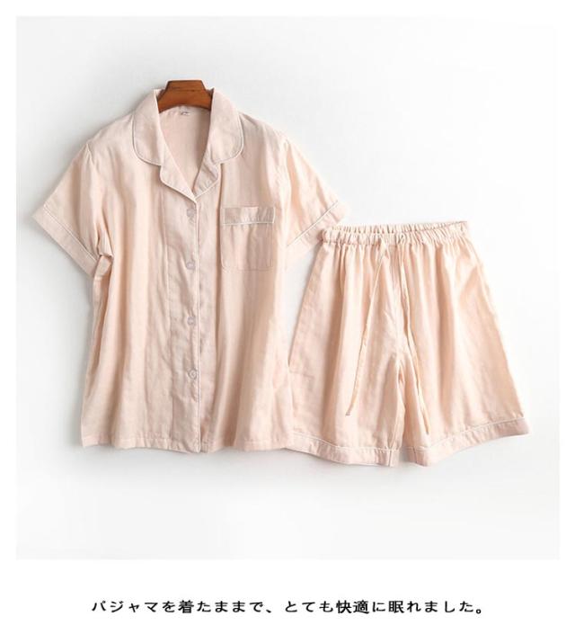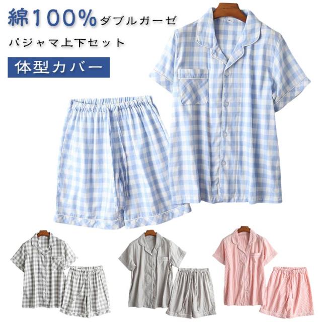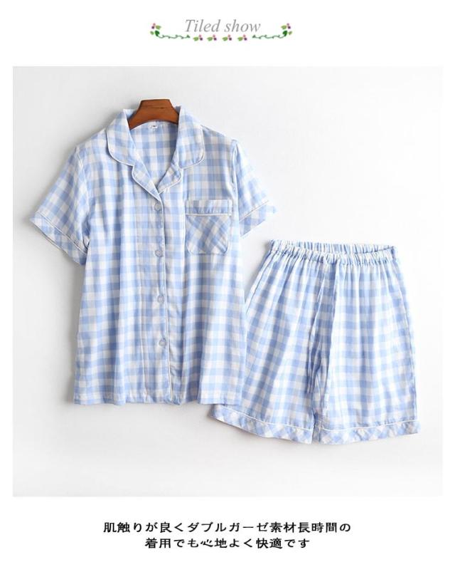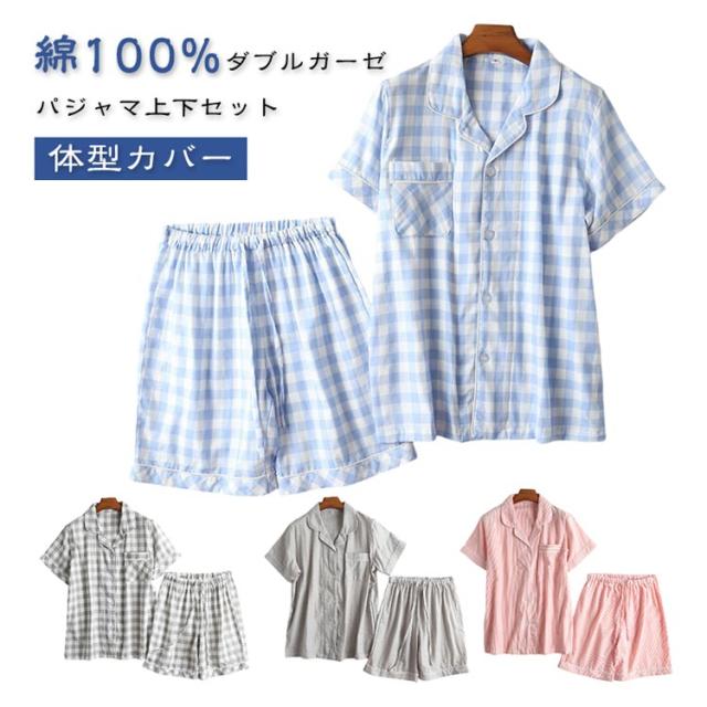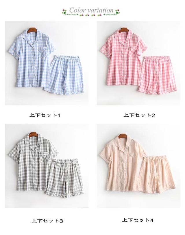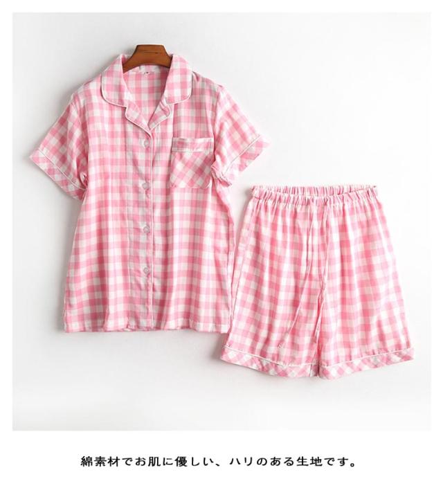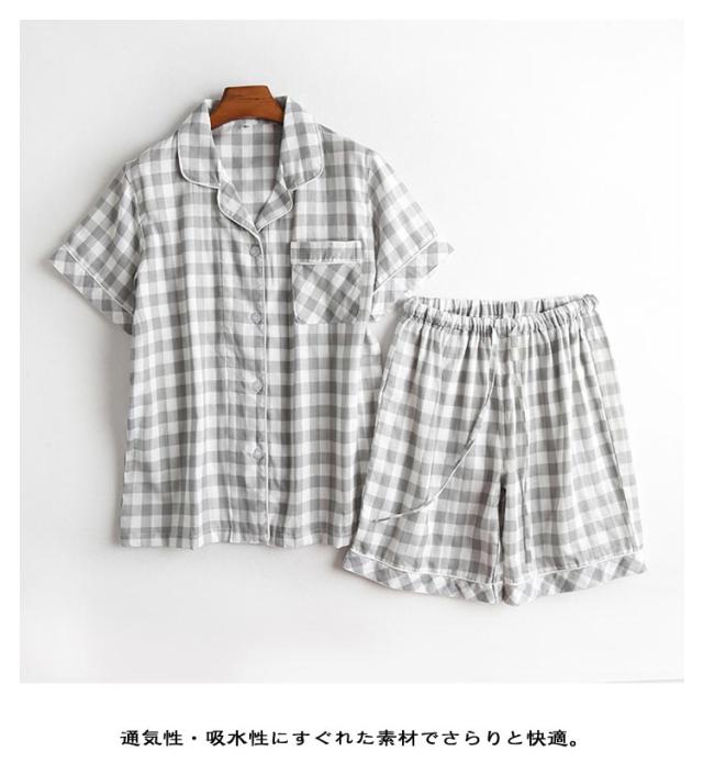 綿100% ダブルガーゼ パジャマ ガーゼ レディース 春 夏 半袖 tシャツ ハーフパンツ 綿 ストラップ チェック 柄 ルームウェア 二重ガーゼ ナイトウェア セットアップ 上下セット トップス パンツ ウエストゴム ふんわり 着心地