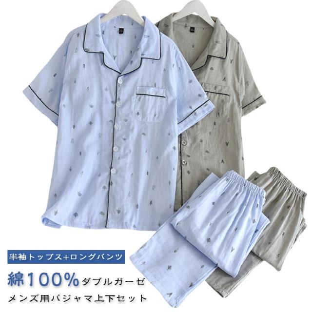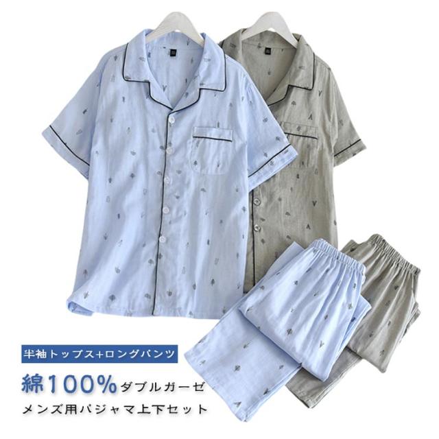 綿100% ダブルガーゼ パジャマ ガーゼ メンズ 春 夏 半袖 tシャツ ロングパンツ 綿 ルームウェア 二重ガーゼ ナイトウェア セットアップ 上下セット トップス パンツ ウエストゴム ふんわり 着心地 ゆったり 体型カバー コットン ボタン付き 入院 30代 40代 50代 プレゼント