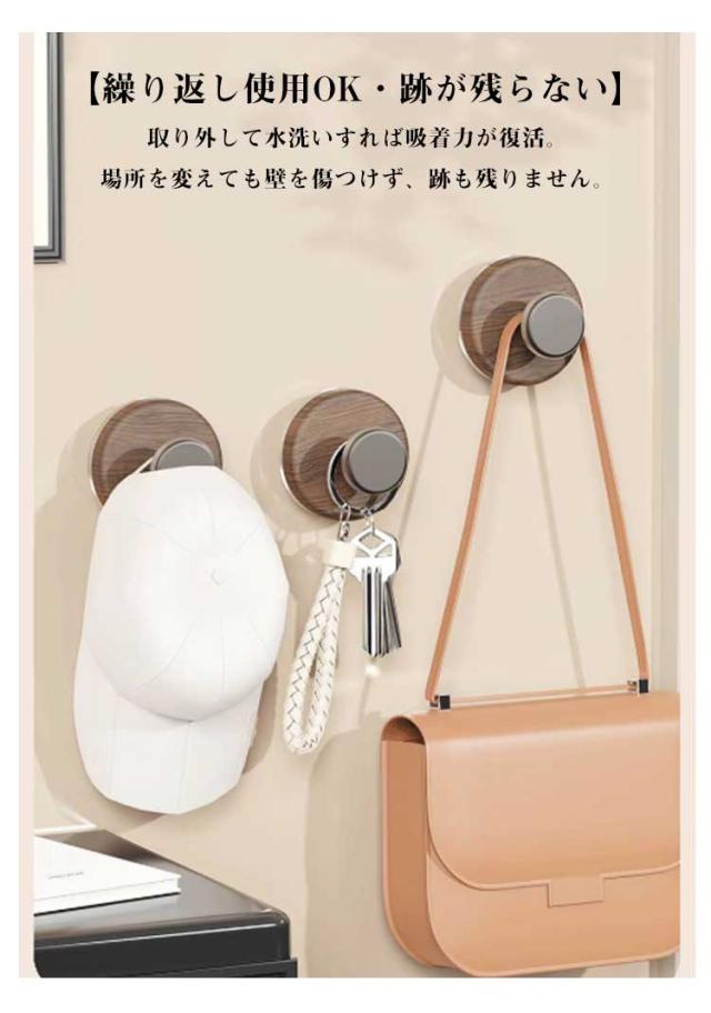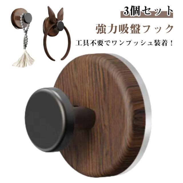 丸型 木目調 強力吸着 強力吸盤フック 吸盤式フック おしゃれ 3個セット 強力吸盤フック 跡が残らない 簡単設置 繰り返し使える 壁掛け 省スペース