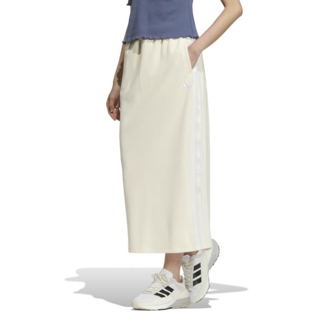 デイリーウェアの必須アイテム、スポーティーなひねりを効かせたスカートは、公園の散歩から、夜の外出まで、柔軟に対応する。ソフトなニット素材が一日中快適な着心地をもたらす。後ろ裾にスリットを入れて動きやすさを高めている。両サイドに配したスリーストライプスが、スポーティーな雰囲気をプラス。