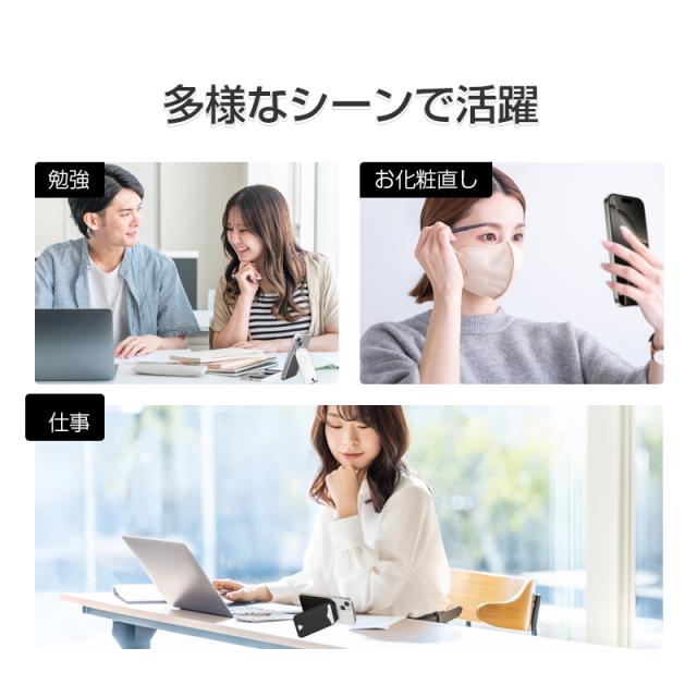 オフィスのデスクではサブ画面用スタンドに、カフェではハンズフリー通話の助手に、そして化粧時にはコンパクトミラーとして多機能に活用可能。重さ70.6gの軽量ボディだから鞄に入れても邪魔にならず、仕事・趣味・日常のシーンを問わず、あらゆるシチュエーションで利便性を発揮します。