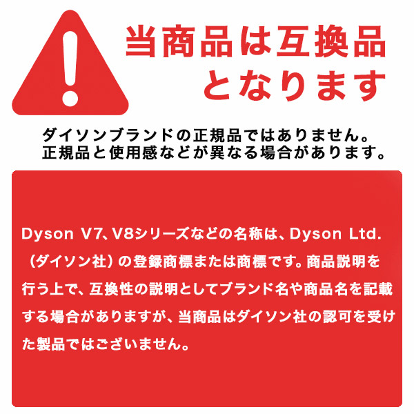 コスパ抜群!本体性能を維持する必須アイテム 愛用のダイソンV10が最近パワーダウン気味…そんな悩みを解決するのが今回ご紹介する 「ダイソンV10シリーズ互換フィルター」です。 純正品と比べてリーズナブルな価格ながら、高品質素材を使用した互換フィルターは、掃除機の性能維持に欠かせないアイテム。 幅広いV10シリーズに対応し、簡単に交換できるため、ユーザーからの支持も急上昇中です! \ダイソンV10シリーズ互換フィルターのここがポイント/ ■幅広い互換性で安心 多くのV10シリーズモデルに対応し、簡単に取り付けできるので交換の手間が最小限です。 ■水洗いでいつも清潔 水洗い可能なので繰り返し清潔に使え、乾燥後の再利用で経済的です。 ■高品質素材で長持ち 耐久性のあるABS素材と高品質HEPAフィルターを採用し、効率的な集塵を実現します。 ■定期交換で性能維持 3-6ヶ月ごとの交換で掃除機の吸引力を維持し、快適な掃除体験を継続できます。 幅広い互換性で安心の使用感 多くのV10シリーズモデルに対応しているのが最大の魅力。 ほとんどのV10シリーズで使用可能です。取り付けも簡単で、交換の手間を最小限に抑えられます。 水洗いでいつでも清潔をキープ このフィルターは水洗い可能な設計になっています。 定期的に水洗いすることで、フィルターに蓄積されたホコリや汚れを効果的に除去でき、繰り返し清潔に使用できます。 洗浄後はしっかり乾燥させることで、カビやニオイの発生も防止。経済的にも環境にも優しい設計です。 高品質素材で長期使用も安心 耐久性に優れたABS素材と高品質HEPAフィルターを採用。 効率的な集塵性能を実現し、微細なホコリやアレルゲンもしっかりキャッチします。 純正品に引けを取らない品質で、コストパフォーマンスの高さが魅力です。 定期交換で掃除機の性能を維持 フィルターは3〜6ヶ月ごとの交換がおすすめ。 定期的な交換により、掃除機の吸引力を維持し、 常に最適な掃除体験を継続できます。交換時期を守ることで、モーターへの負担も軽減され、 掃除機本体の寿命も延ばせるでしょう。 【スタッフVoice】 コスパ最強の必需品!掃除機の命を守る救世主 「純正品と比較して半額以下で購入できるのに、フィルター性能はほぼ同等。特に水洗い後の乾きの良さは純正品より優れている印象です。 取り付けも簡単で、掃除機の吸引力が目に見えて回復しました。複数セットでの購入もおすすめです。 ただし、一部の2021年・2022年ジャパネットモデルには対応していないので、購入前に対応機種の確認は必須です! 【対応機種】 ダイソン SV12 V10 シリーズ Cyclone V10 Fluffy 、 Cyclone V10 Fluffy+ 、 Cyclone V10 Motorhead 、 Cyclne V10 Absolute Extra 、 Cyclon V10 Absolute Pro 、 Cyclone V10 Animal+ ※以下の製品には使用できません ・2021年ジャパネットモデル Cyclone V10 Motorhead (SV12 MH YE) ・2021年ジャパネットモデル Cyclone V10 Motorhead (SV12 MH PU) ・2022年モデル Cyclone V10 Fluffy (SV12 FF LF) 【パッケージ内容】 フィルター × 1個 ■かんたんに取り換えできるダイソンV10シリーズ互換性のあるフィルターです。 ■水洗い可能です。洗った後はよく乾かしてから装着してください。カビやニオイの原因になります。 ■耐久製のあるABS素材、高品質のHAPAフィルターを採用しています。 ■フィルターは消耗品になりますので、快適に使用するため3-6ヵ月で交換する必要があります。 【商品特徴・キーワード】 ダイソンV10互換フィルター SV12フィルター交換 Cyclone V10フィルター ダイソン掃除機部品 V10フィルター水洗い ダイソン互換パーツ コードレスクリーナーメンテナンス 【注意事項】 ※本商品には説明書が付属しておりません。使用方法に関しては商品ページをご参照ください。 ※商品画像はご覧になっているモニターやPCなどの環境、解像度により、実物と多少カラーが異なる場合がございます。 色味やサイズが異なるなどのクレームはご対応致しかねますので、予めご了承ください。 ※輸送中に外装に傷やへこみが起こる場合がございますが、商品に影響はございませんので、予めご了承のもとお買い求めください。 ※本商品は海外からの輸入品ですので、細かい傷や汚れなどある場合がございます。予めご了承のもとお買い求めください。 ※こちらの商品は安価にご提供するため、簡易包装、簡易パッケージとなっております。 ※製造時期によって一部デザインが変更になる場合がございます。予めご了承のもとお買い求めください。 ※本商品を使用した事による、直接もしくは間接的に生じた損害、事故、怪我、故障について当店は一切の責任を負いません。 ※本商品はすべての環境、機器との使用を保証するものではございません。一部の機器では環境、相性等により使用できない場合がございます。予めご了承ください。 ※フィルターに水分が残っていると、水分が吸い込まれてモーターの故障の原因になります。 排気フィルター・スポンジフィルターは、風通しの良いところで十
