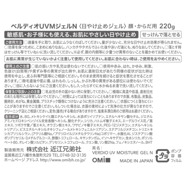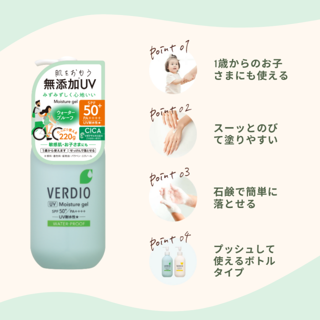 ベルディオ UV モイスチャージェル N 220g 日焼け止め 無添加 ウォータープルーフ SPF50+ PA++++ 敏感肌 子供 石鹸で落とせる ポンプ 顔 からだ
