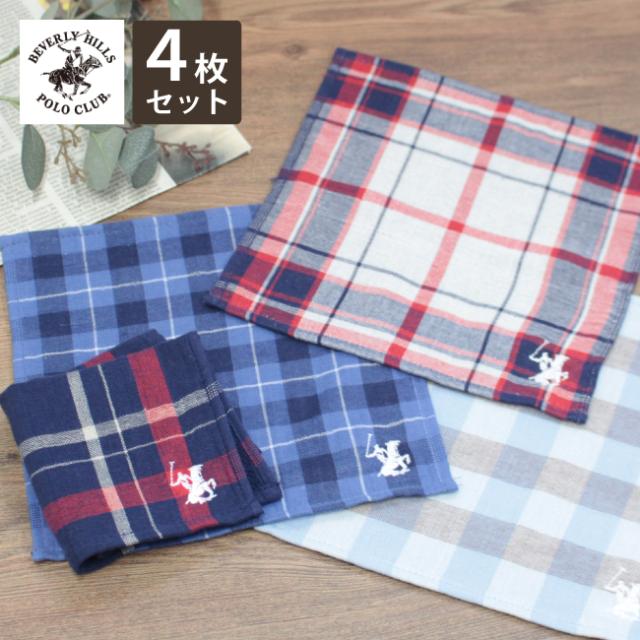 ハンカチ ミニハンカチ ウォッシュタオル 4枚セット まとめ買い 洗い替え チェック柄 ビバリーヒルズポロクラブ 刺繍 ロゴ ガーゼ パイル 吸水 速乾 23×23cm おしゃれ カジュアル メンズ レディース 男性 男女兼用 タオル プレゼント POLO ギフト