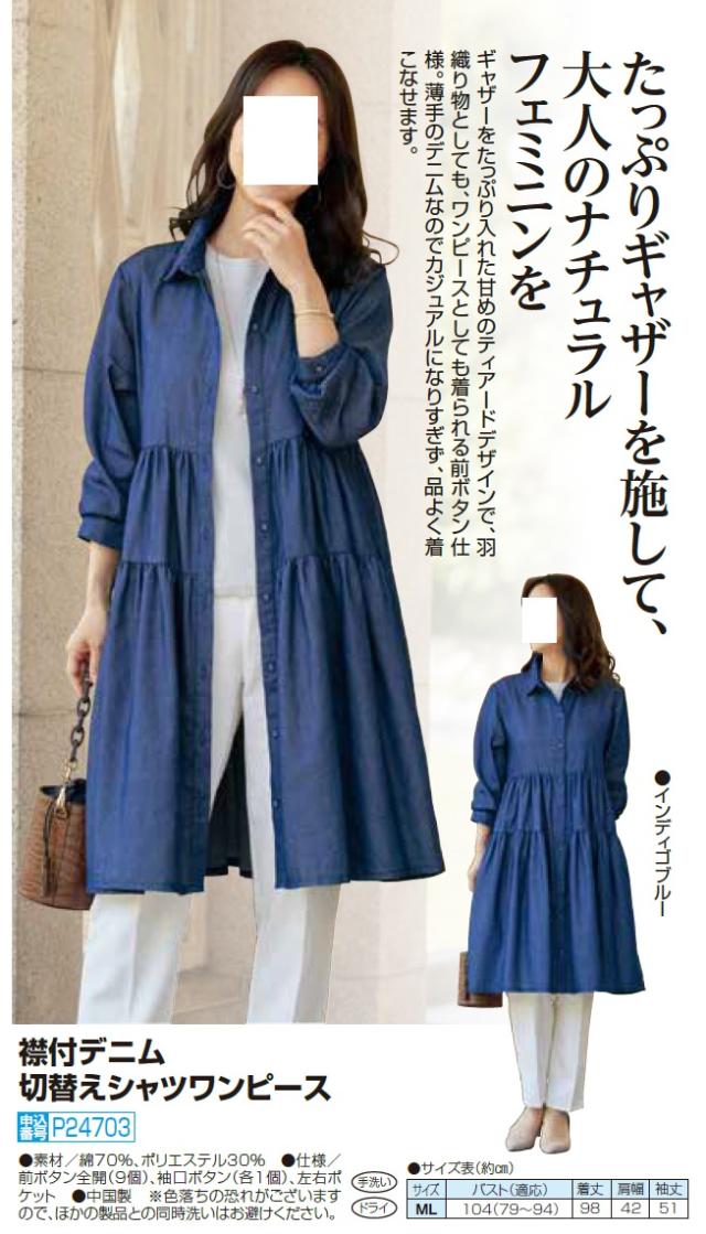 襟付デニム切替えシャツワンピース インディゴブルー ワンピース デニム シャツワンピース 長袖 膝丈 レディース 婦人服 ミセス シニア 女性 ブルー ティアード フレア フェミニン 薄手 羽織りもの シンプル 50代 60代 70代 80代 母の日 お母さん 春夏 nss p24703