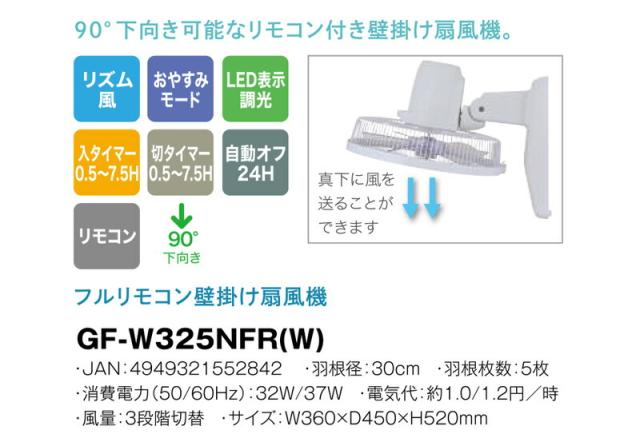 フルリモコン壁掛け扇風機 GF-W325NFR(W) おおたけ 90°下向き可能 リモコン付き 壁掛け扇風機 首振り フルリモコン 壁かけ扇風機 タイマー 首振り 風量3段階 冷暖房効率アップ 壁掛け 扇風機 ![]() ![]() ![]() ![]() | ||||