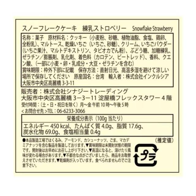 | その他 | ・三叔公(サン・シュウ・ゴン社)は100年以上の歴史をもつ台湾の老舗お菓子メーカーです。昔ながらの伝統菓子から、伝統菓子をベースに現代風にアレンジした食べやすいお菓子、また今ではその他にも様々な種類のお菓子を製造し世界中に送りだしています。 ・スノーフレークケーキは台湾でも大人気定番スイーツのかき氷を「練乳かき氷をお菓子にしたらどうなるのか!?」というコンセプトのもと開発された商品です。 ・サクサク食感とムニュムニュ食感をいう食感の組み合わせと、濃厚な練乳イチゴが絶妙にマッチしたとっても美味しい新感覚なお菓子です。 |